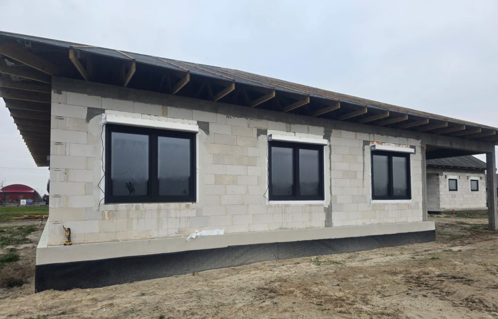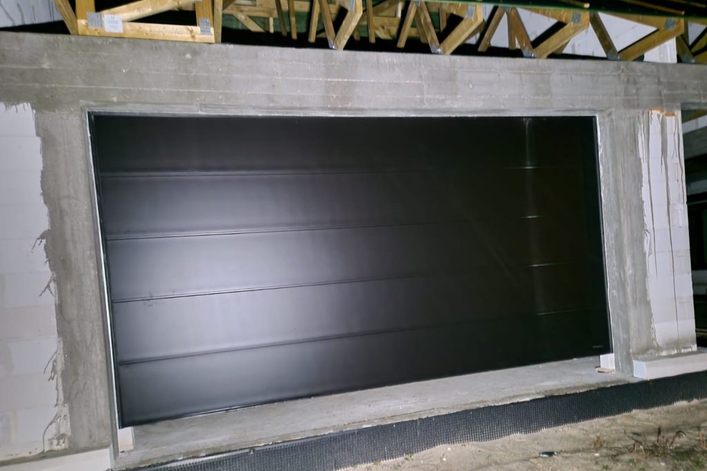 Poniżej prezentujemy zdjęcia po montażu stolarki okiennej Drutex Iglo Edge w kolorze zewnętrznym i wewnętrznym Jet Black Mattex z czarnymi klamkami Dublin. Klient zdecydował się również na bramy garażowe segmentowe UniTerm od producenta Wiśniowski w kolorze modern black ze strukturą panela silkline z napędem i szyną spark. Klient wybrał również drzwi zewnętrzne KMT. Model 75 Plus Max posiada lustro weneckie i jest ono w kolorze matowym czarnym z klamką lambda. Model 54 Plus posiada klamkę quatro czarną. Całość budowy uzupełniają czarne matowe rolety Portos IT2000.
