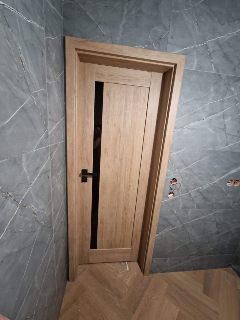 Przed Państwem kolejna realizacja drzwi wewnętrznych ERKADO. Klient zdecydował się na przylgowe drzwi z kolekcji FREZJA w kolorze dąb premium z czarnym szkleniem VSG 221 wraz z klamkami Rumba. Drzwi GRAF posiadają szklenie VSG/ESG 441 bezbarwne z czarną aplikacją.