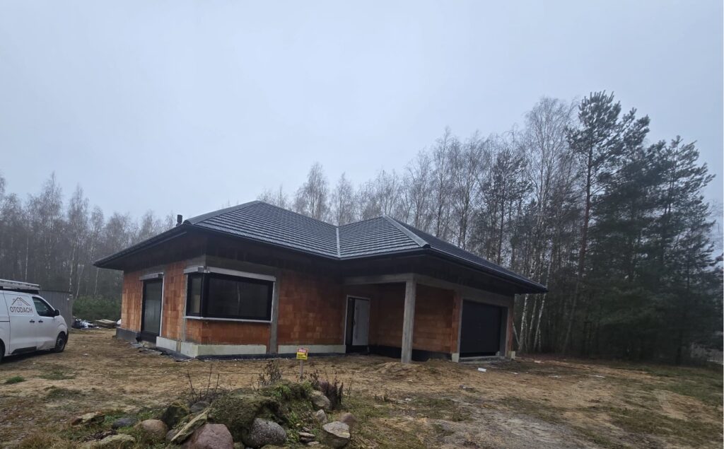 w której zastosowano stolarkę okienną marki Eko-Okna w systemie Salamander BluEvolution 82, w kolorze czarny mat SAL018, zarówno od strony wewnętrznej, jak i zewnętrznej. W budynku zamontowano również bramę garażową UniPro marki Wiśniowski o strukturze panela Smoothgrain, w kolorze Black Ulti-Mat. Brama została wyposażona w napęd i szynę MOTO. Drzwi zewnętrzne pochodzą od producenta MARTOM i wykonane są w standardzie Arktic alu fullpers, model C00, w kolorze czarnym. Zastosowano w nich skośny, prostokątny pochwyt o długości 150 cm wykonany ze stali nierdzewnej inox. Dodatkowo zamontowano rolety zewnętrzne Portos TR7 w systemie IT2000, w kolorze czarnym, z napędem radiowym oraz 16-kanałowym pilotem sterującym. Klient zdecydował się także na zakup pokrycia dachowego Horizon Ceramic Matt od producenta Bratex w kolorze czarnym RAL 9005, wraz z kompletnym systemem orynnowania Struga.