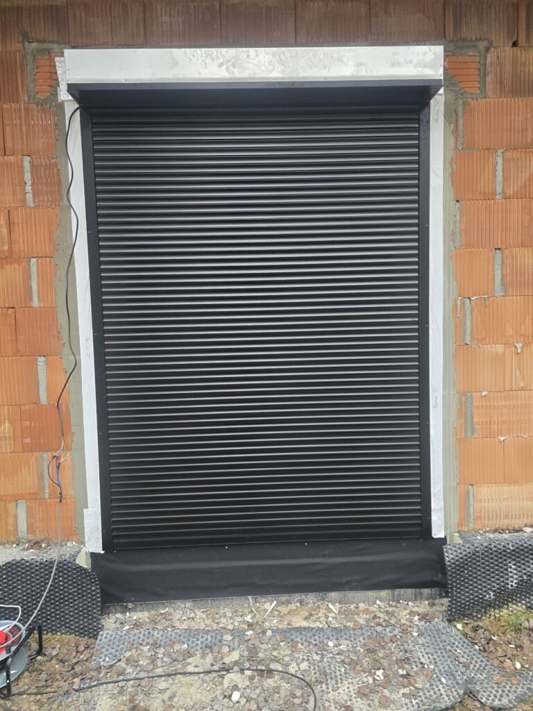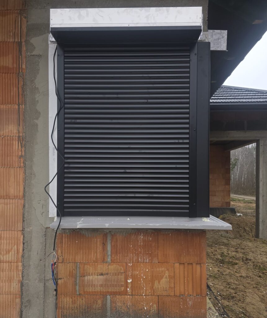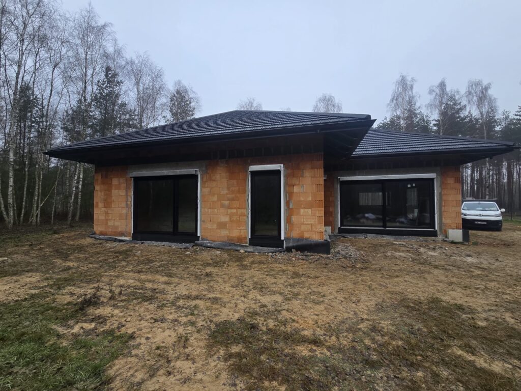 w której zastosowano stolarkę okienną marki Eko-Okna w systemie Salamander BluEvolution 82, w kolorze czarny mat SAL018, zarówno od strony wewnętrznej, jak i zewnętrznej. W budynku zamontowano również bramę garażową UniPro marki Wiśniowski o strukturze panela Smoothgrain, w kolorze Black Ulti-Mat. Brama została wyposażona w napęd i szynę MOTO. Drzwi zewnętrzne pochodzą od producenta MARTOM i wykonane są w standardzie Arktic alu fullpers, model C00, w kolorze czarnym. Zastosowano w nich skośny, prostokątny pochwyt o długości 150 cm wykonany ze stali nierdzewnej inox. Dodatkowo zamontowano rolety zewnętrzne Portos TR7 w systemie IT2000, w kolorze czarnym, z napędem radiowym oraz 16-kanałowym pilotem sterującym. Klient zdecydował się także na zakup pokrycia dachowego Horizon Ceramic Matt od producenta Bratex w kolorze czarnym RAL 9005, wraz z kompletnym systemem orynnowania Struga.