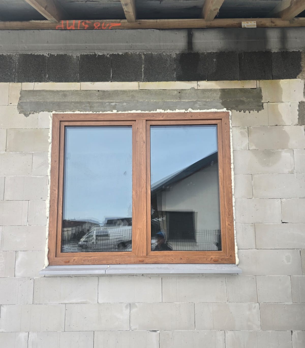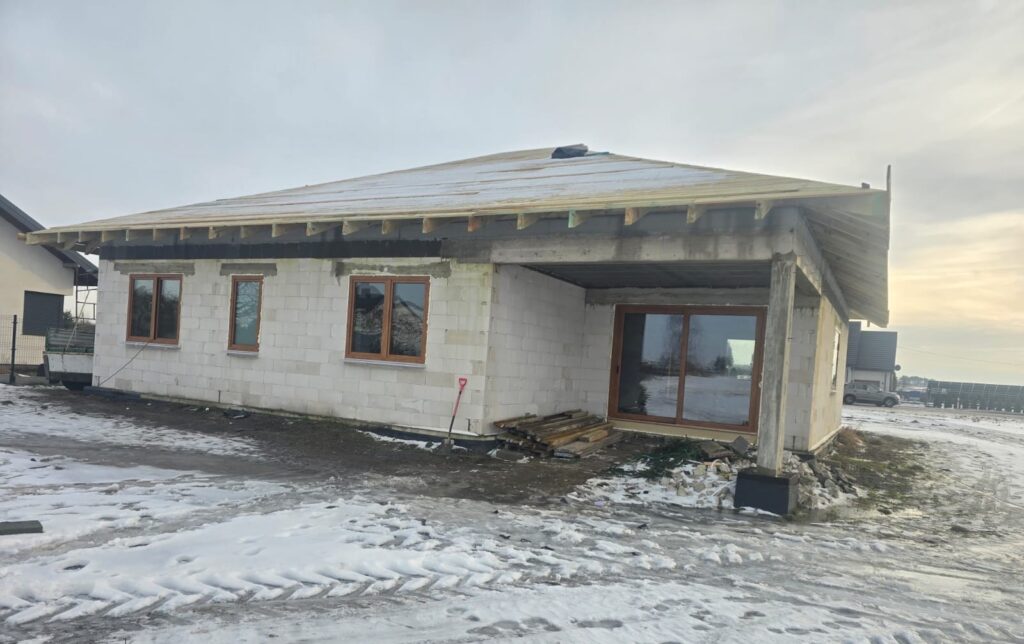 Dodatkowo klient zdecydował się na stolarkę okienną DRUTEX S.A. w systemie Iglo Edge, również w kolorze Winchester — zarówno od strony zewnętrznej, jak i wewnętrznej. Zastosowane czarne klamki Dublin oraz zgrzew V-Perfect podkreślają estetykę i precyzję wykonania.