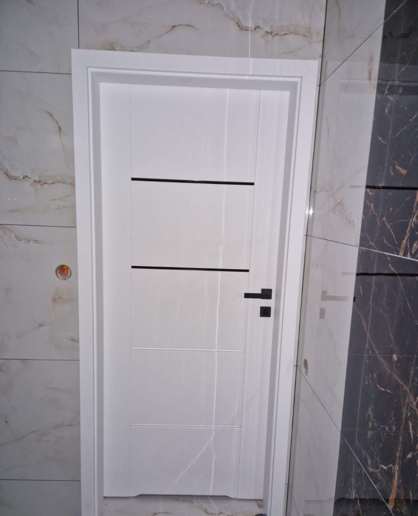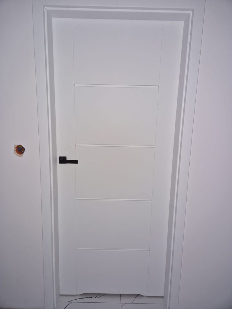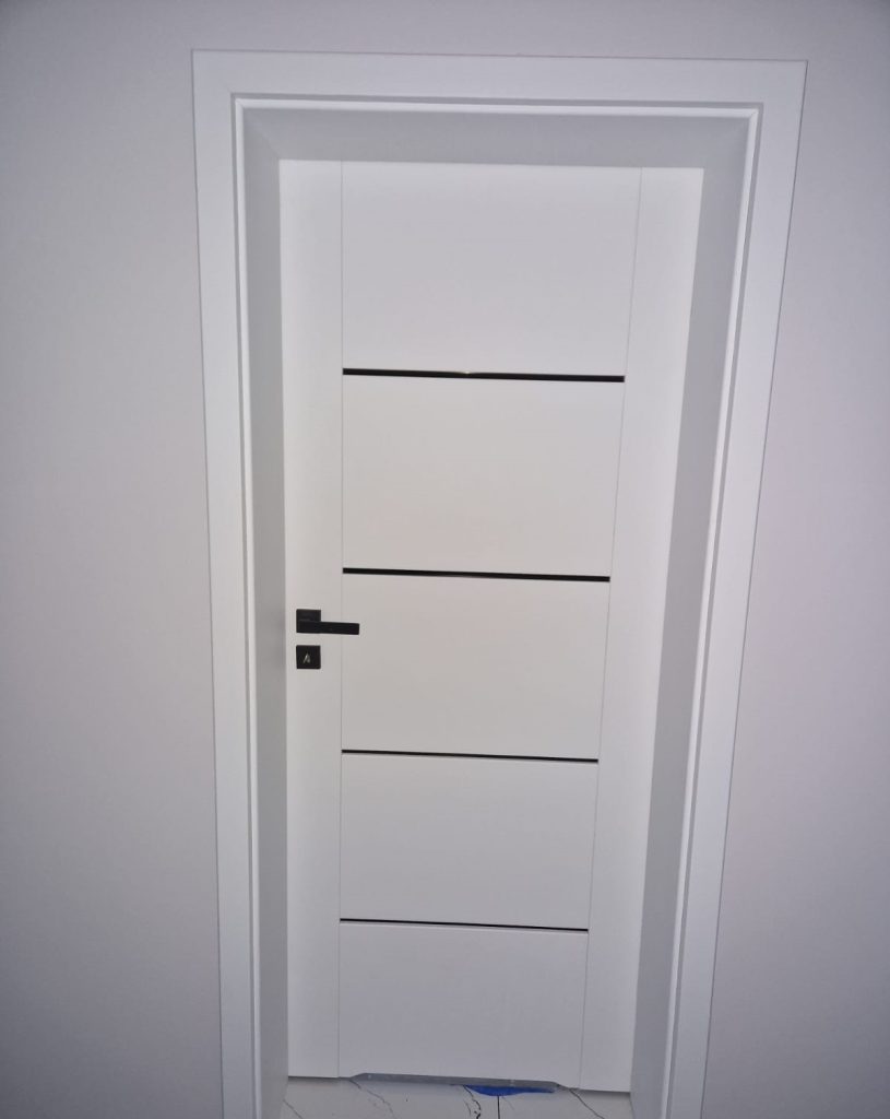 Klient zdecydował się na białe skrzydła przylgowe oraz bezprzylgowe wraz z matowymi klamkami Rumba w kolorze czarnym. Dodatkowo wybrał szklenie VSG 221 czarne.