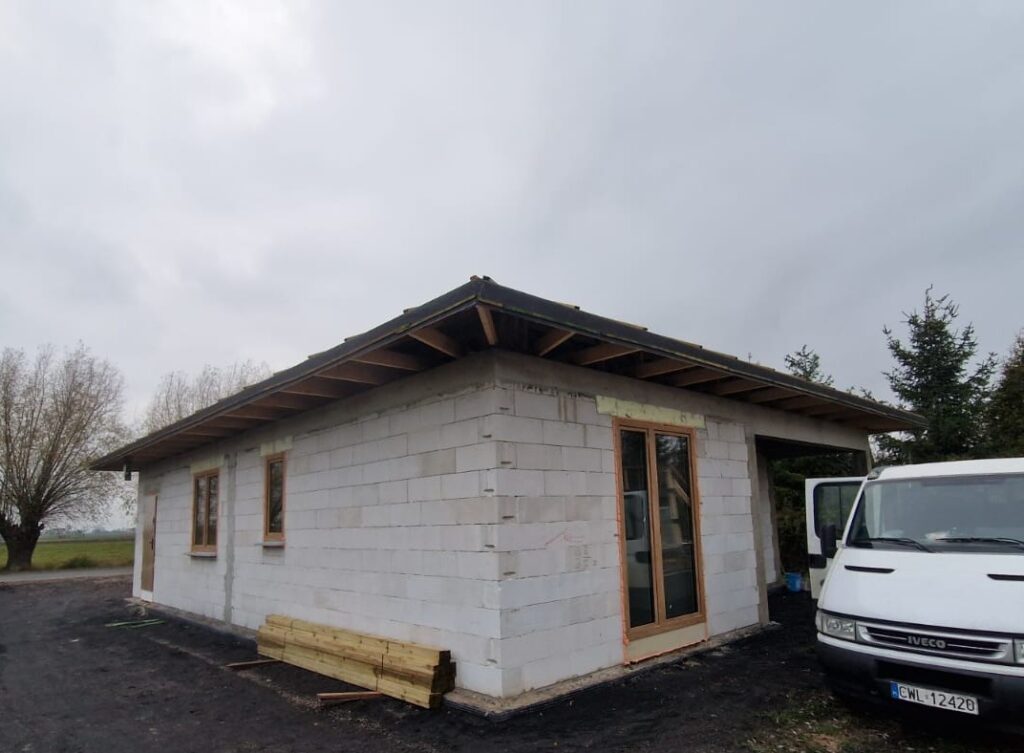 Klient zdecydował się na stolarkę okienną DRUTEX S.A. w systemie Iglo Energy Classic, w kolorze antracytowym od zewnątrz i białym od wewnątrz. Dodatkowo zamontowaliśmy rolety zewnętrzne Portos TR7 IT2000 w kolorze antracytowym, wyposażone w centralę TR7 inteligentnego domu. W zakresie stolarki drzwiowej klient wybrał drzwi MARTOM w standardzie ARKTIC, model A00, w kolorze antracyt jedwabny, z pochwytem z przyciskiem o długości 160 cm w kolorze czarnym. Zamontowane zostały również drzwi WIKĘD z linii Basic tłoczone, w kolorze antracyt gładki. W garażu znalazły się bramy BIG TOR , w kolorze antracyt, z panelem typu Florencja, pełnym, bez przetłoczeń, o strukturze skórki pomarańczy. Dodatkowo klient zdecydował się na zakup paneli podsufitkowych z fugą w kolorze 7016 Ultramat od producenta Bratex Dachy. Całość tworzy spójny, nowoczesny i energooszczędny efekt, który z pewnością będzie służył inwestorom przez długie lata.