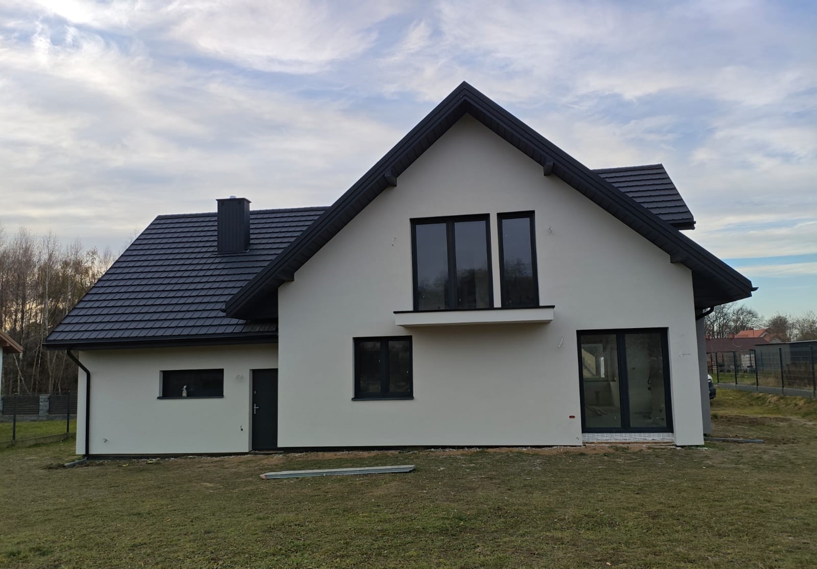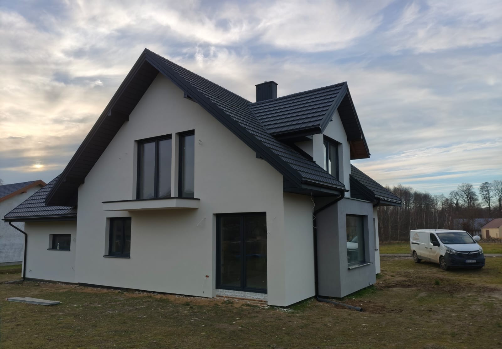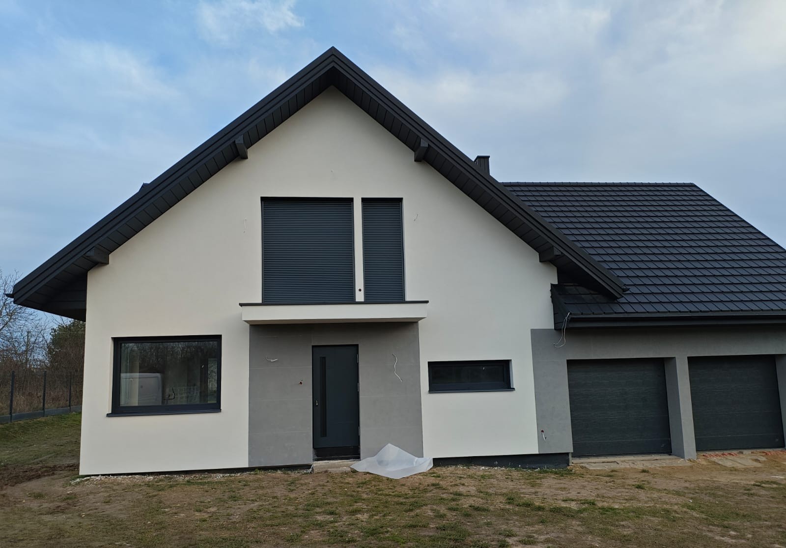 Klient zdecydował się na stolarkę okienną DRUTEX S.A. w systemie Iglo Energy Classic, w kolorze antracytowym od zewnątrz i białym od wewnątrz. Dodatkowo zamontowaliśmy rolety zewnętrzne Portos TR7 IT2000 w kolorze antracytowym, wyposażone w centralę TR7 inteligentnego domu. W zakresie stolarki drzwiowej klient wybrał drzwi MARTOM w standardzie ARKTIC, model A00, w kolorze antracyt jedwabny, z pochwytem z przyciskiem o długości 160 cm w kolorze czarnym. Zamontowane zostały również drzwi WIKĘD z linii Basic tłoczone, w kolorze antracyt gładki. W garażu znalazły się bramy BIG TOR , w kolorze antracyt, z panelem typu Florencja, pełnym, bez przetłoczeń, o strukturze skórki pomarańczy. Dodatkowo klient zdecydował się na zakup paneli podsufitkowych z fugą w kolorze 7016 Ultramat od producenta Bratex Dachy. Całość tworzy spójny, nowoczesny i energooszczędny efekt, który z pewnością będzie służył inwestorom przez długie lata.
