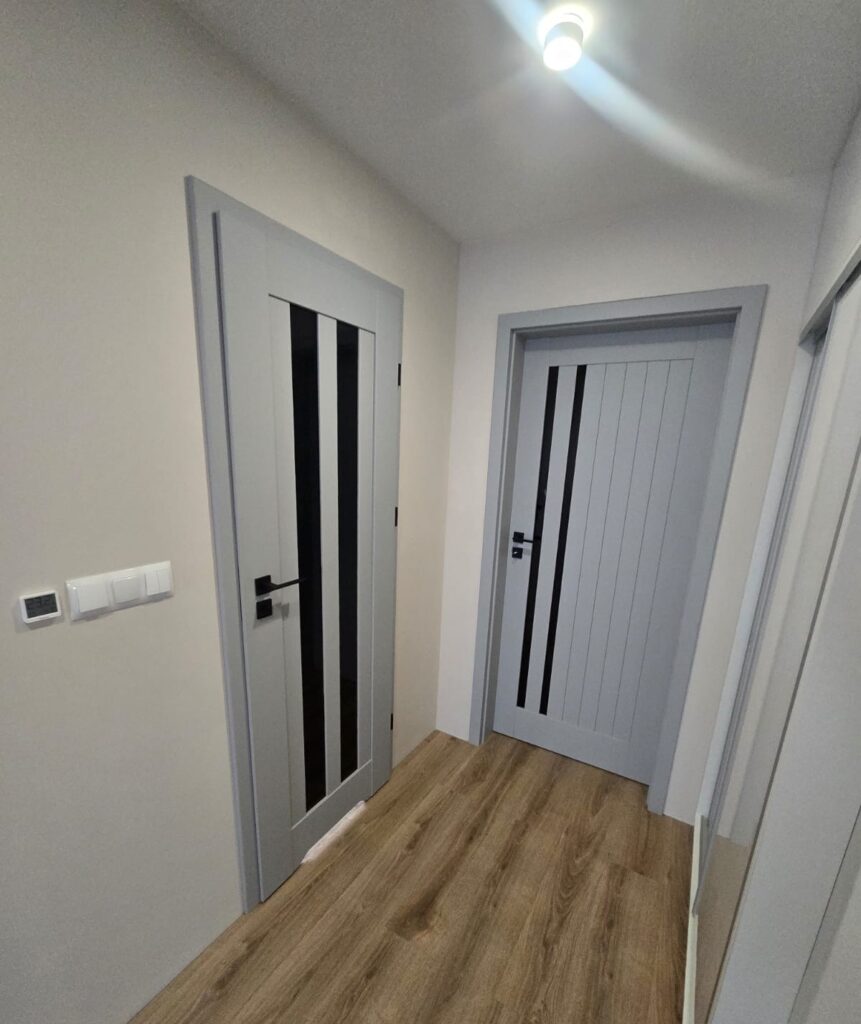 Klient zdecydował się na drzwi wewnętrzne marki Erkado. Wybrano przylgowe modele Epimedium 6 oraz Epimedium 4 w kolorze popielatym ST CPL, wyposażone w regulowane ościeżnice oraz czarne okucia. Drzwi posiadają przeszklenia VSG 221 w kolorze czarnym, a całość uzupełniają klamki Quanta Fit w wykończeniu czarny mat.