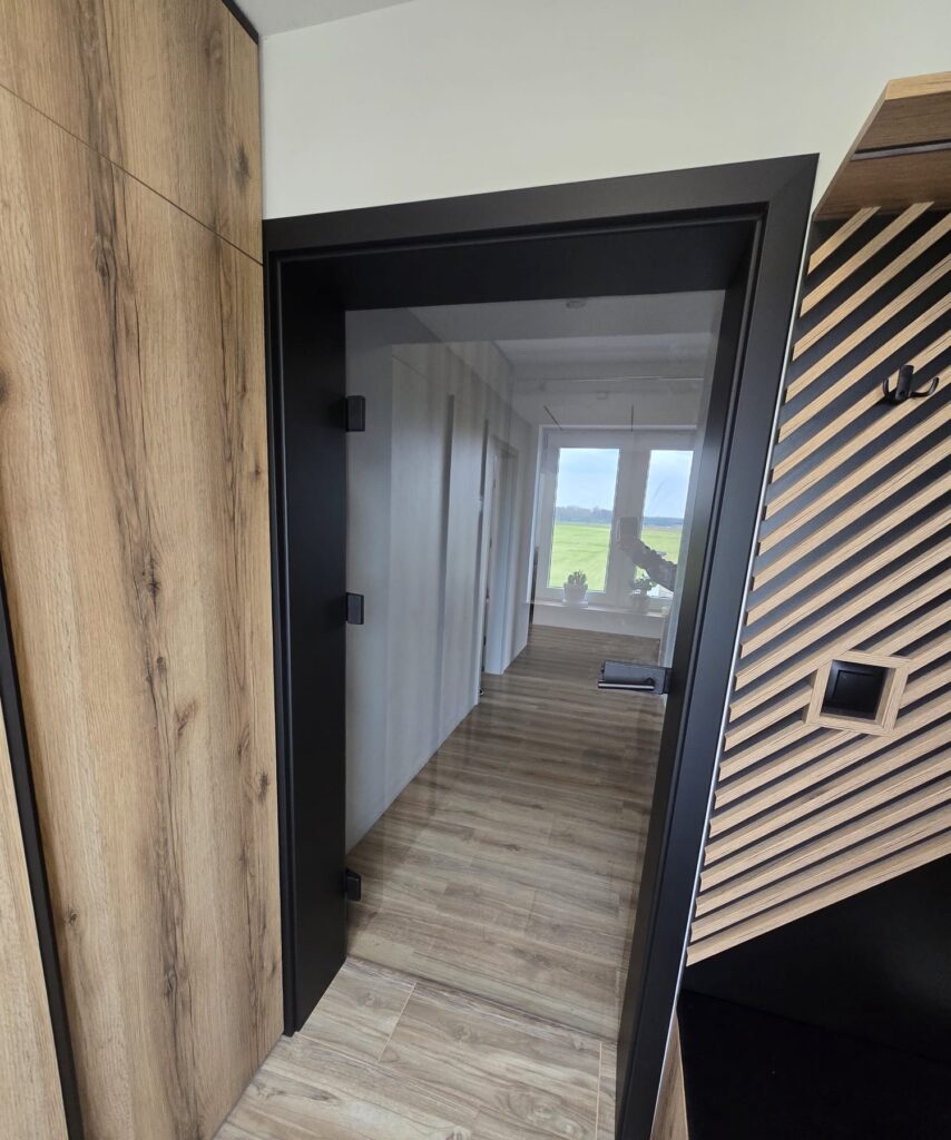 Dodatkowo klient zakupił wewnętrzne drzwi szklane Graf 9 z hartowaną szybą o grubości 8 mm, wyposażone w regulowane ościeżnice oraz czarne okucia z zestawu 1B Slim.