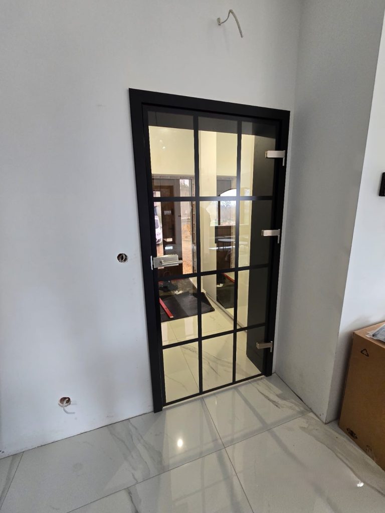Klient zdecydował się na szybę hartowaną bezbarwną z ościeżnicą regulowaną do drzwi szklanych w kolorze czarnym.