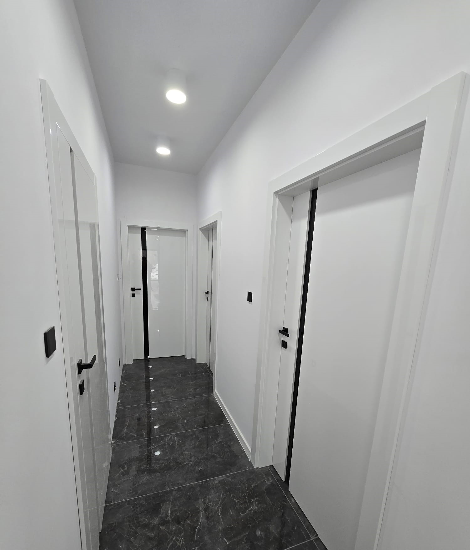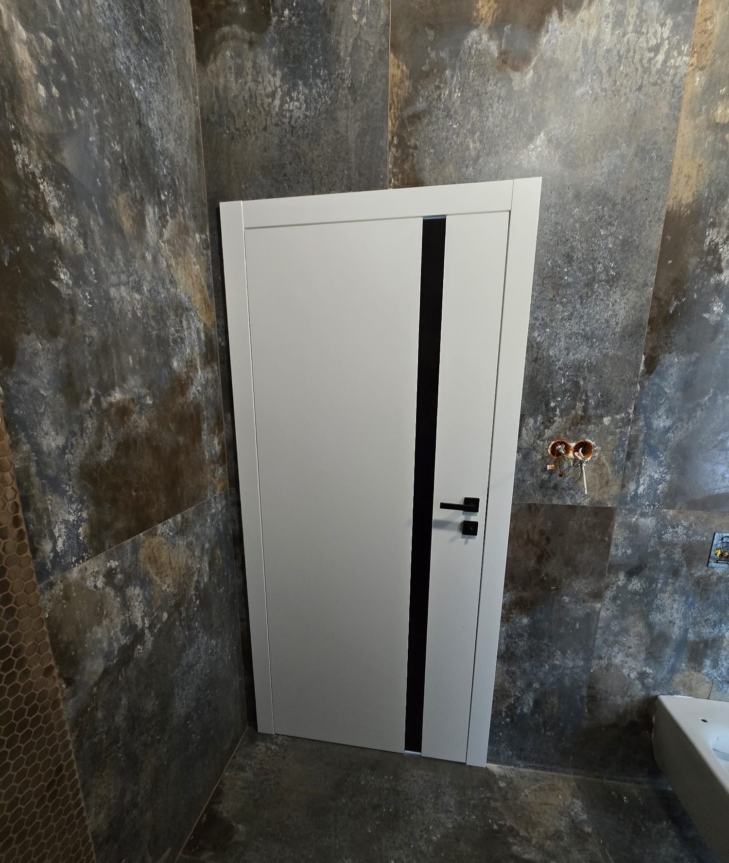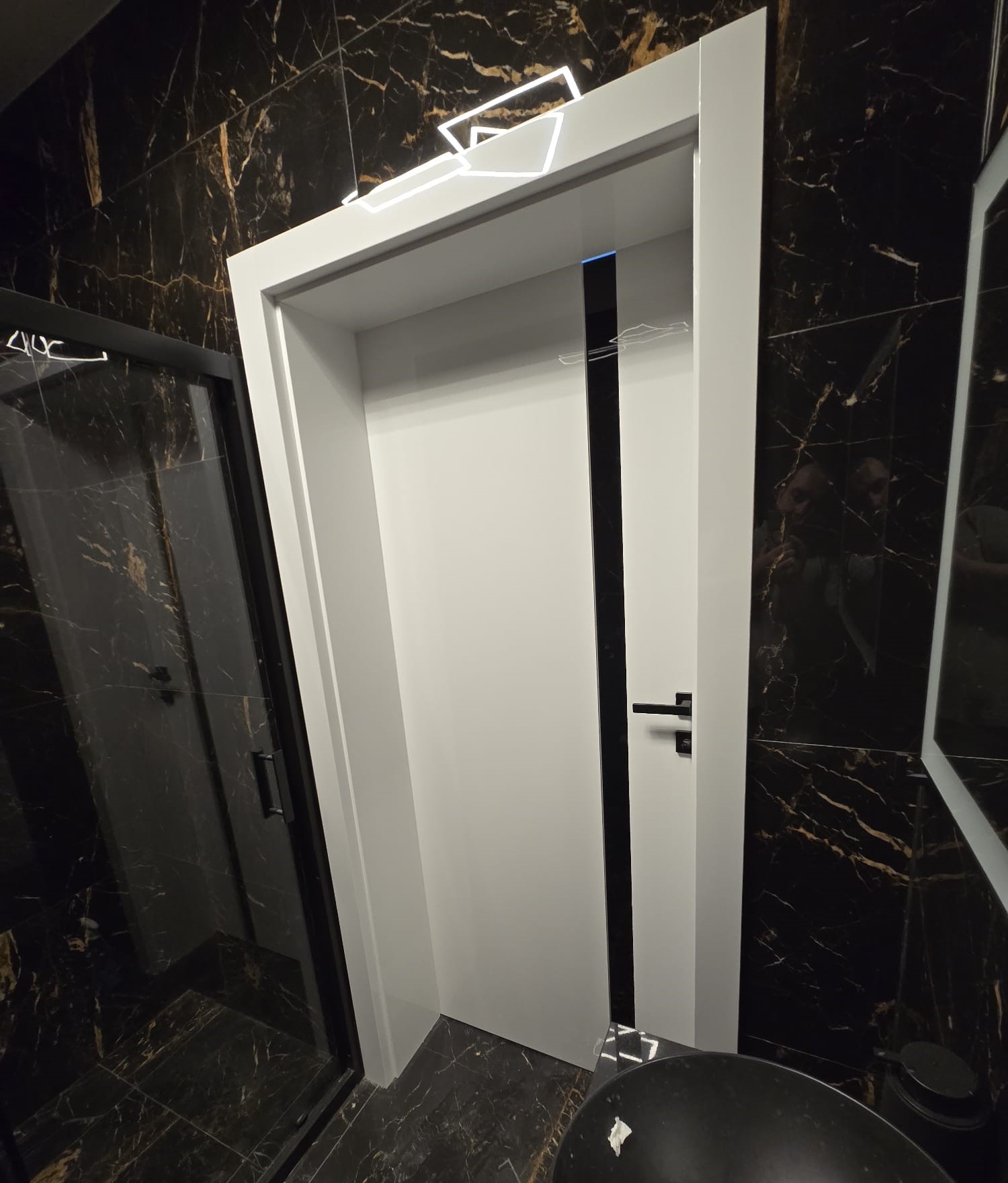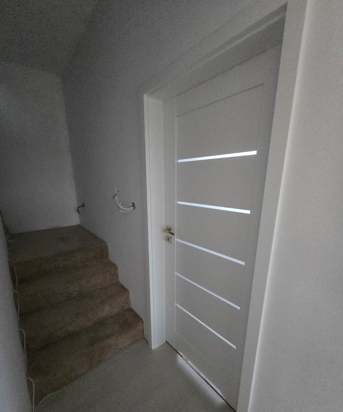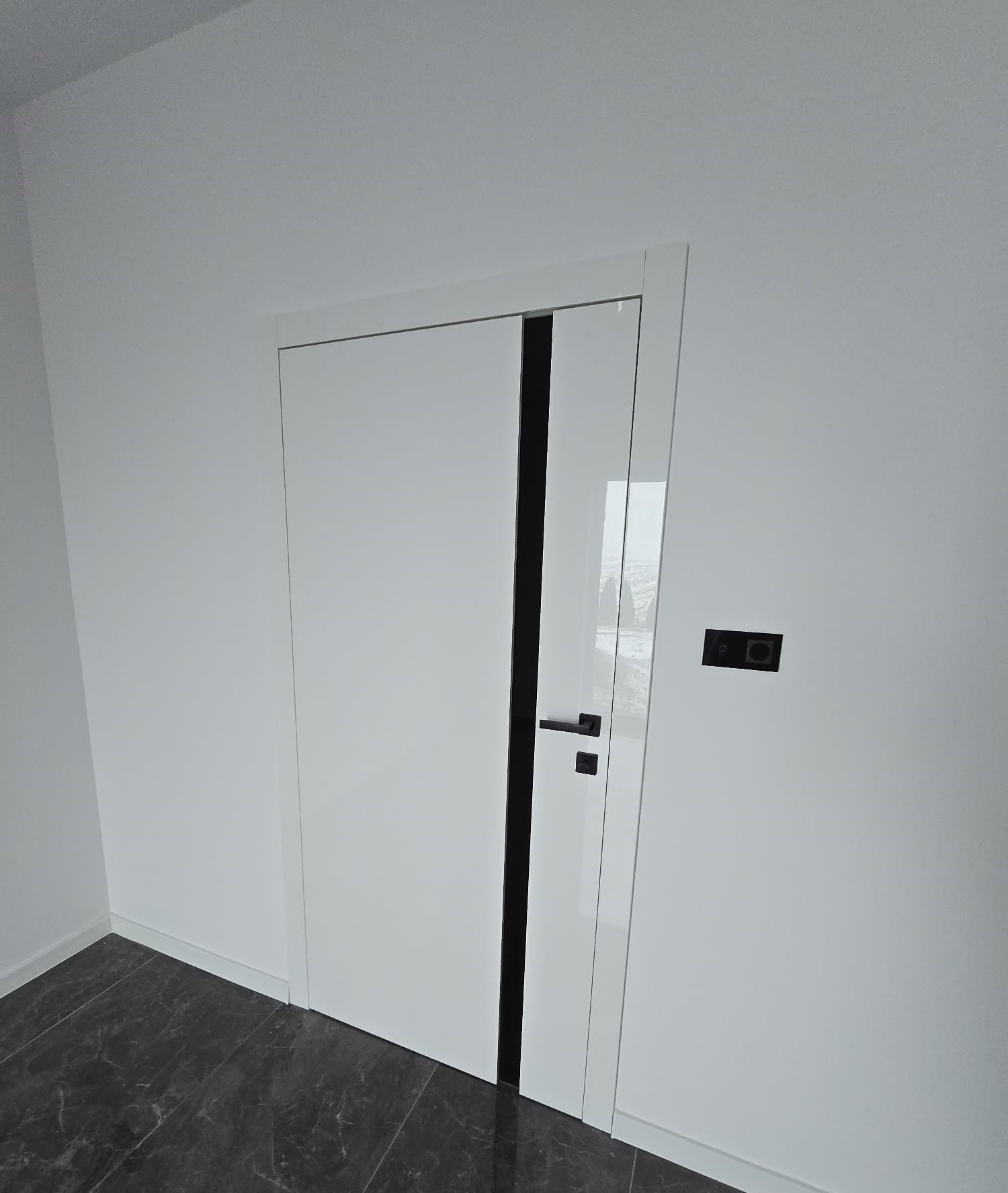 Klient zdecydował się na skrzydło bezprzylgowe w kolorze bianco (połysk) z klamką o modelu FA18-008-WEGA-CM. W drzwiach zastosowano szybę zespoloną bezpieczną MAT DRE o grubości 8 mm. Model ten jest wypełniony płytą wiórowo-otworowa z zawiasami chowanymi. Musimy przyznać że jest to wspaniała realizacja!