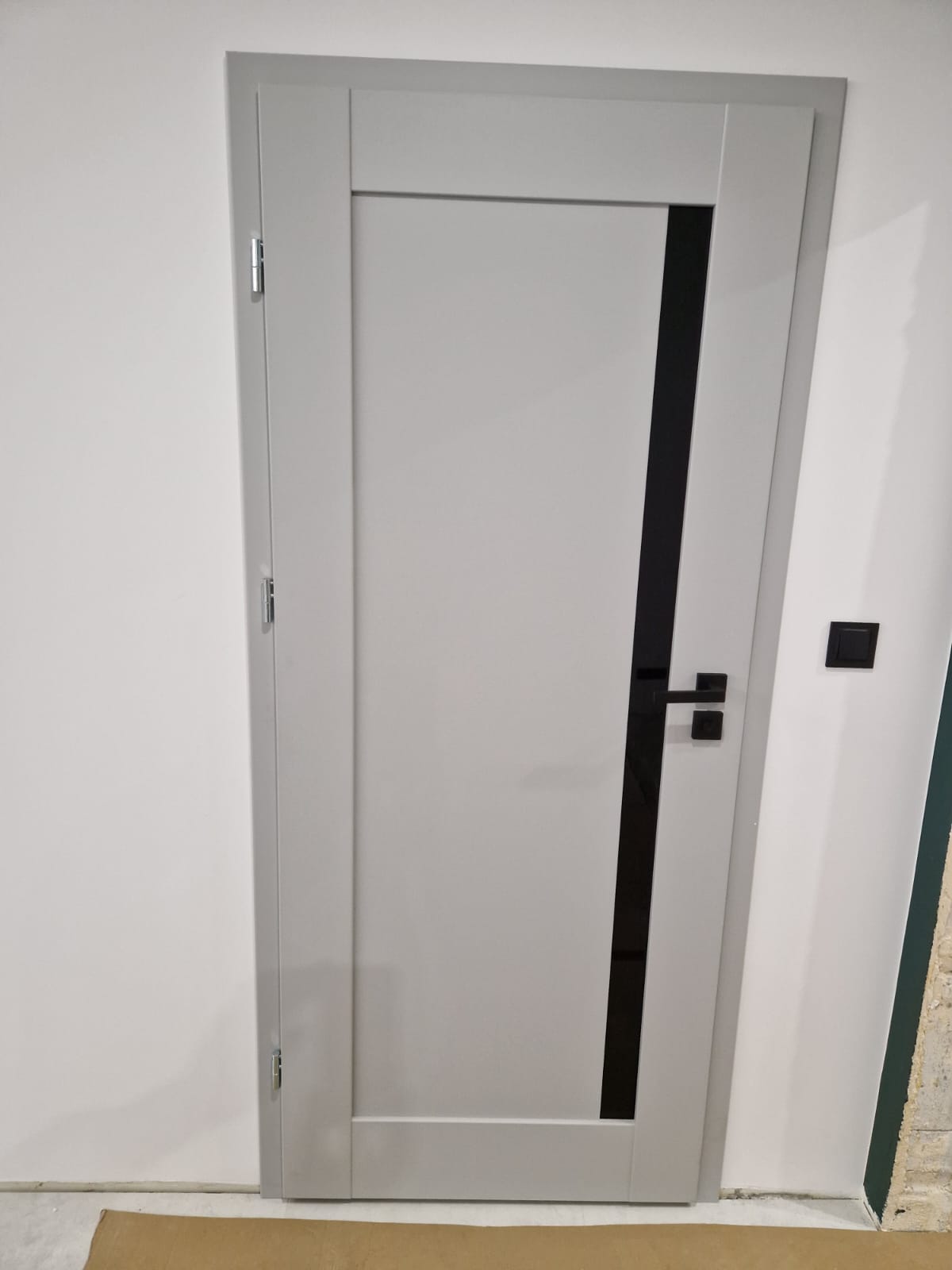 Klient zdecydował się na białe skrzydła przylgowe oraz bezprzylgowe wraz z matowymi klamkami Rumba w kolorze czarnym. Dodatkowo wybrał szklenie VSG 221 czarne.