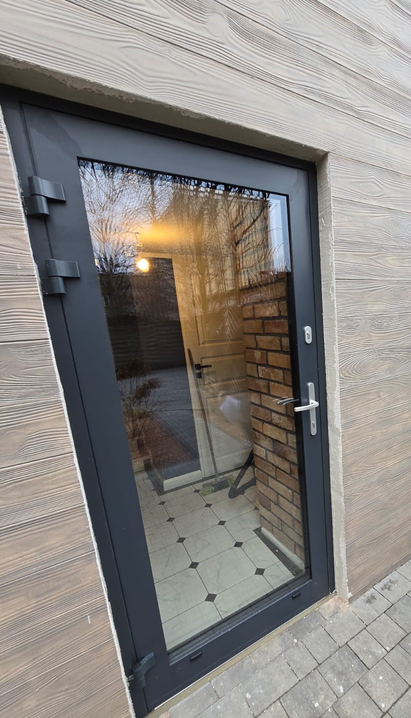 2. Drzwi zewnętrznych Arktic Alu Fullpers od producenta Martom w kolorze antracyt molet z przeszkleniem 56D Lustro weneckie oraz klamką Haga Inox.