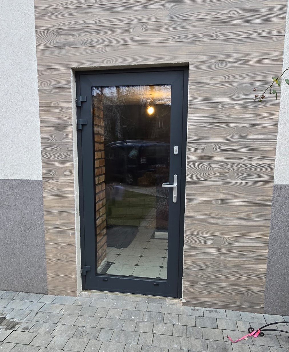 Klient zdecydował się na skrzydło przylgowe w kolorze popielatym wraz z czarną matową klamką QUBIK. Dodatkowo wybrał szklenie VSG 211 w kolorze czarnym.