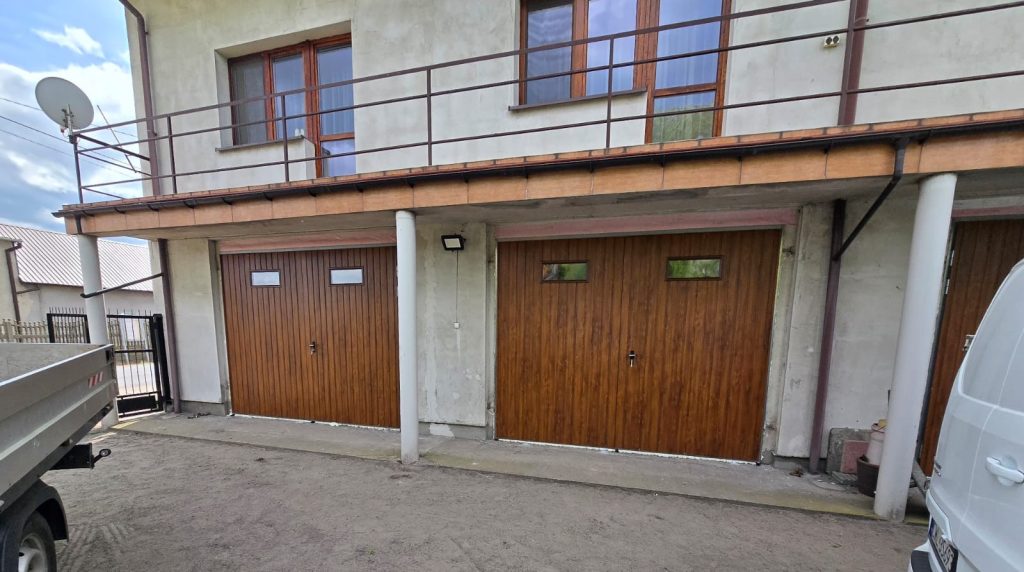 Krótka fotorelacja po montażu bram rozwiernych dwuskrzydłowych Wiśniowski z wypełnieniem pionowym oraz symetrycznym podziałem skrzydeł. Bramy są w kolorze złoty dąb.