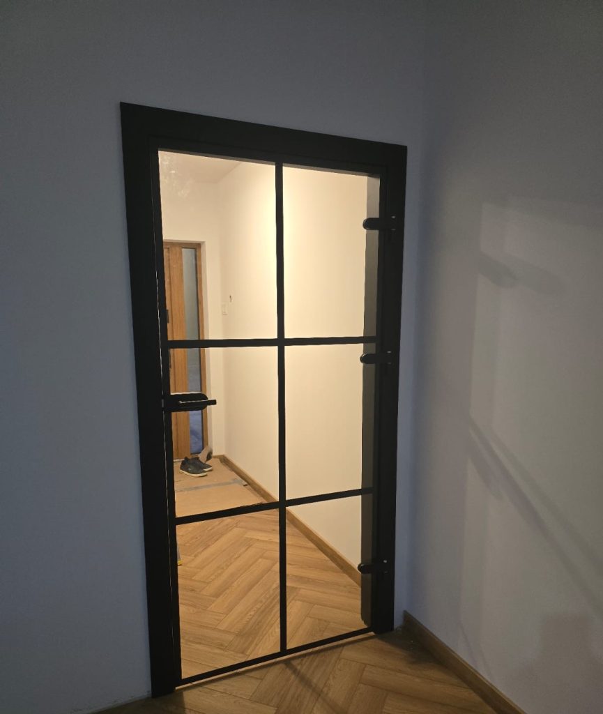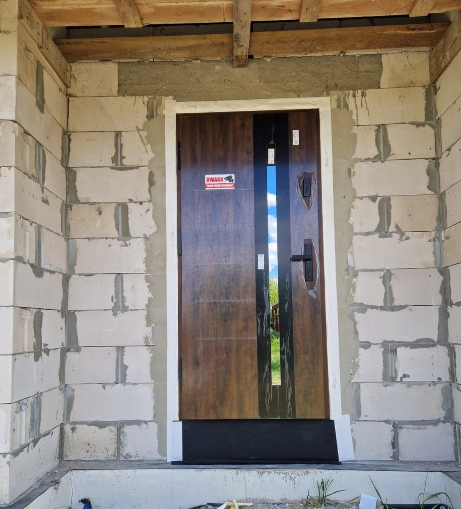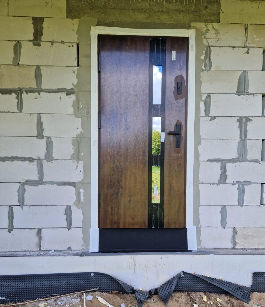 Drzwi zewnętrznych w standardzie ARKTIC. Modele F 62/10 oraz G 14/3 w kolorze orzech ciemny z przeszkleniami lustro weneckie.