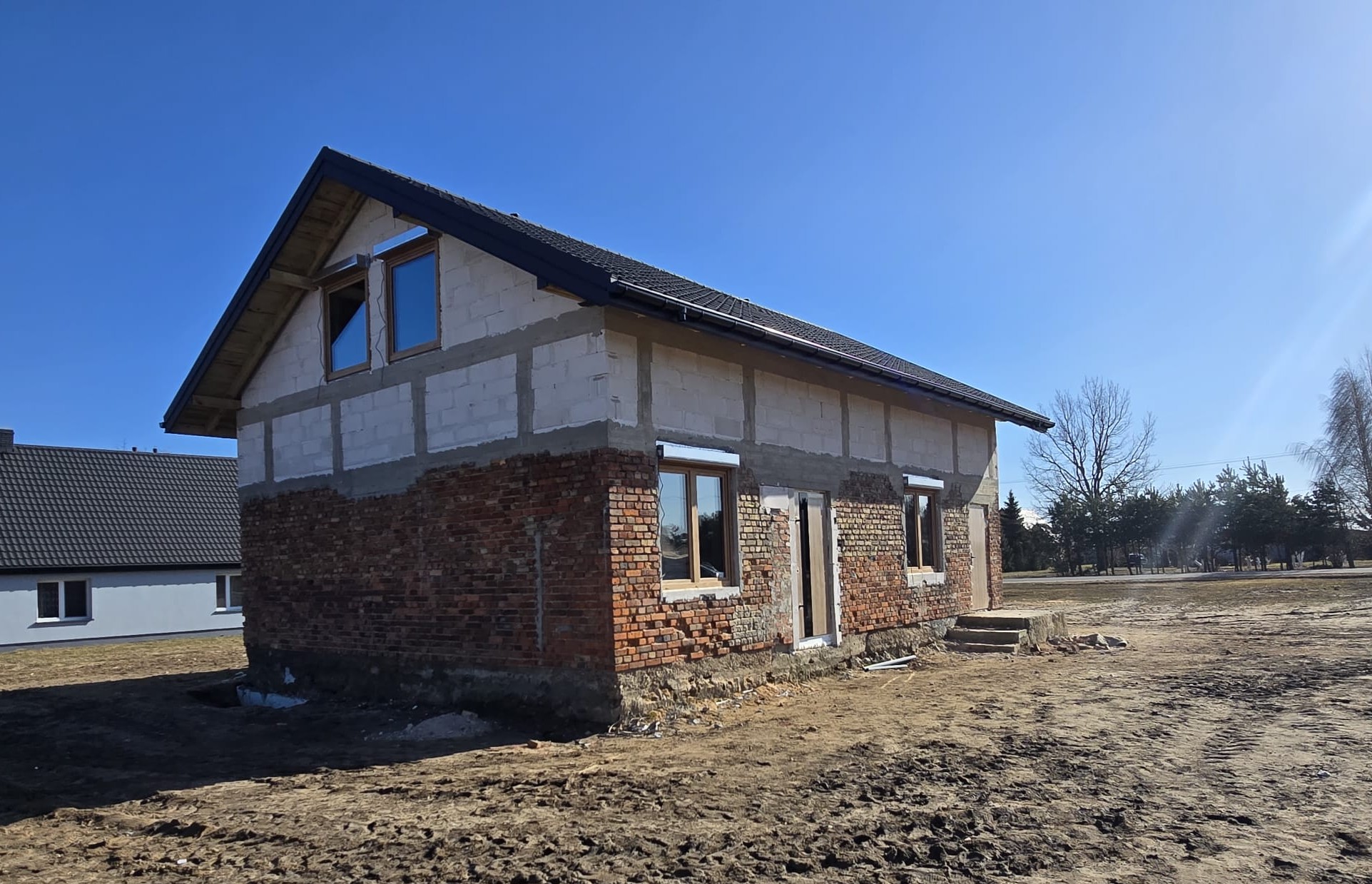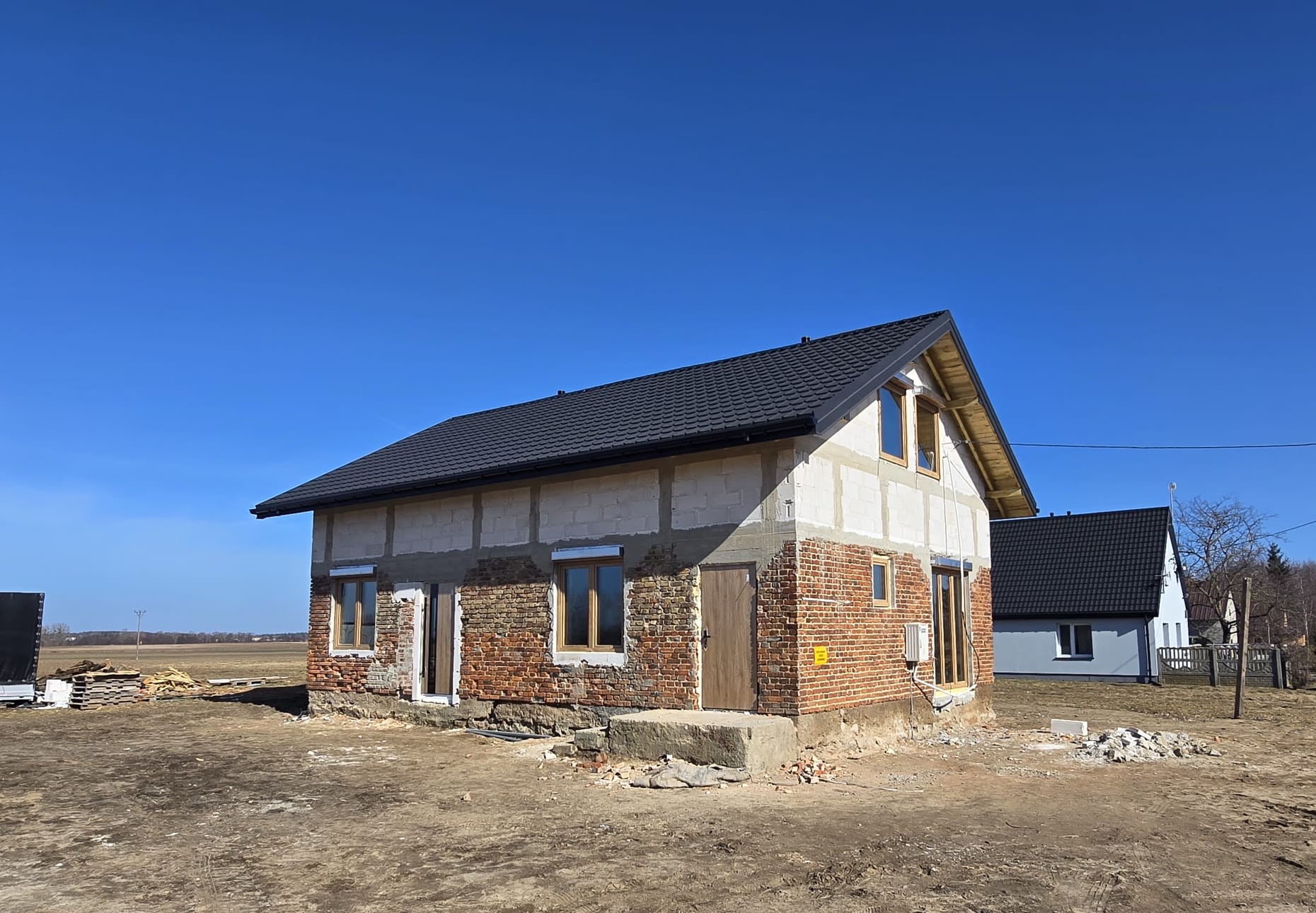 W tej inwestycji zastosowano stolarkę okienną firmy DRUTEX S.A. w systemie Iglo Edge, w kolorze Turner Oak zarówno od zewnątrz, jak i od wewnątrz. Okna zostały wykonane ze zgrzewem V-Perfect oraz wyposażone w czarne klamki Dublin. Zamontowano również drzwi zewnętrzne marki MARTOM w standardzie ARKTIC, model GS 17/17, w kolorze Dąb Turner. Drzwi posiadają przeszklenie 17A Reflex brąz (od wewnątrz z czarną ramką aluminiową) oraz skośny pochwyt z przyciskiem o długości 150 cm w kolorze czarnym. Dodatkowo zastosowano drzwi w standardzie NORDIC, model G 00, również w kolorze Dąb Turner, wyposażone w czarną klamkę Haga. W realizacji wykorzystano także rolety zewnętrzne Portos TR7 w systemie IT 2000, w kolorze Woodec Turner Oak.